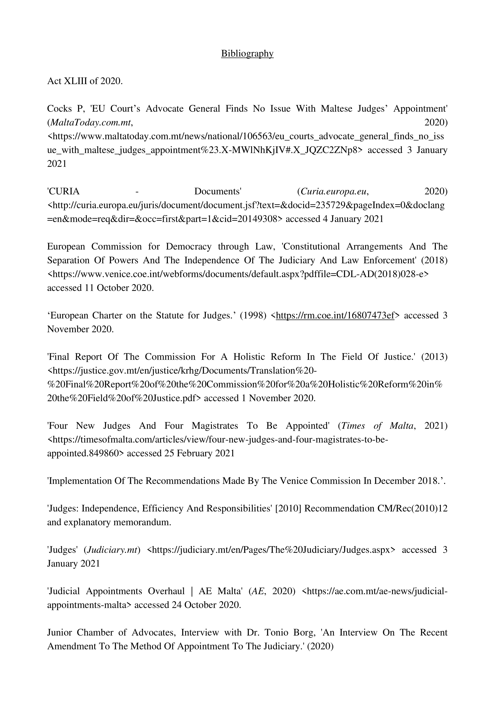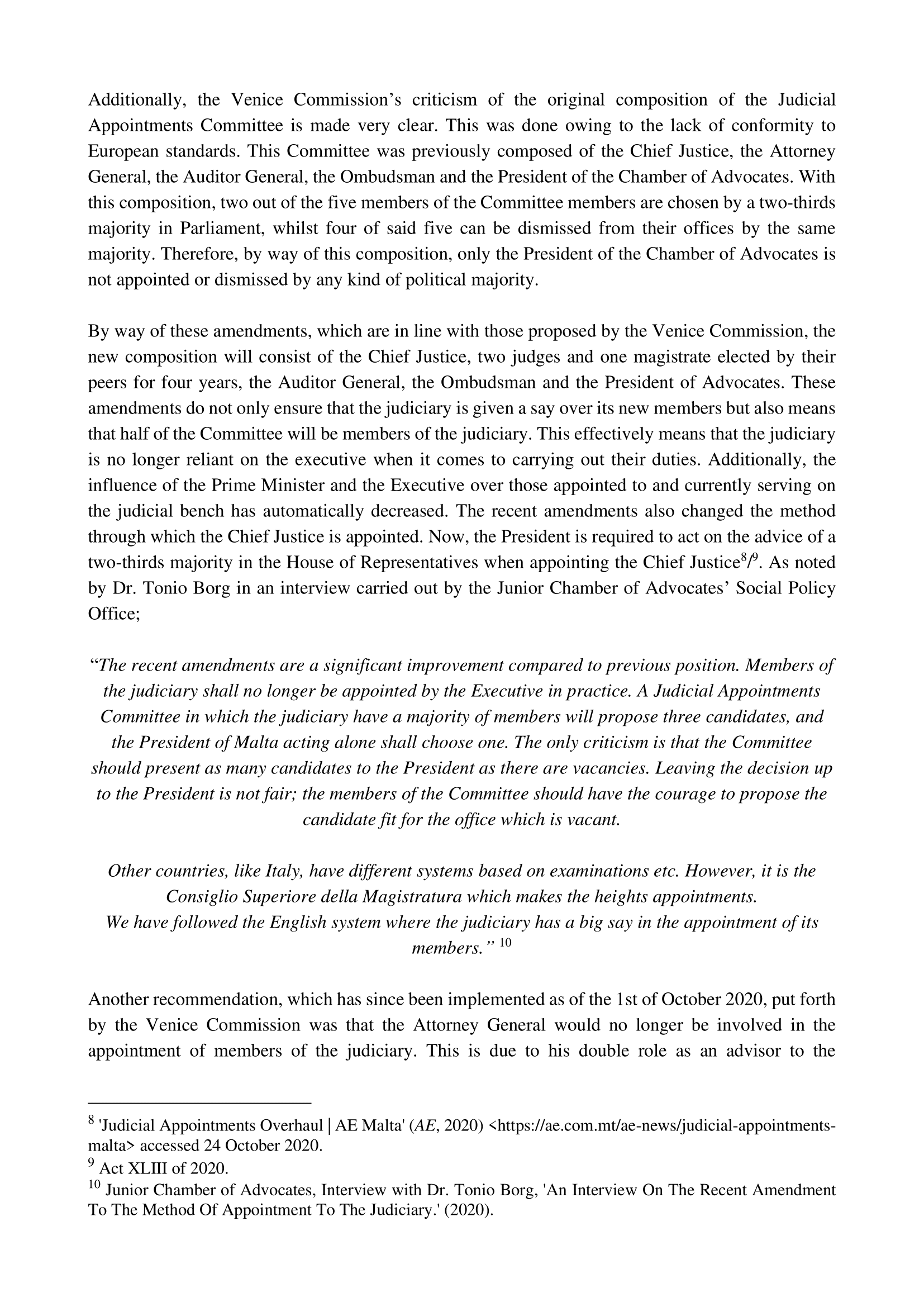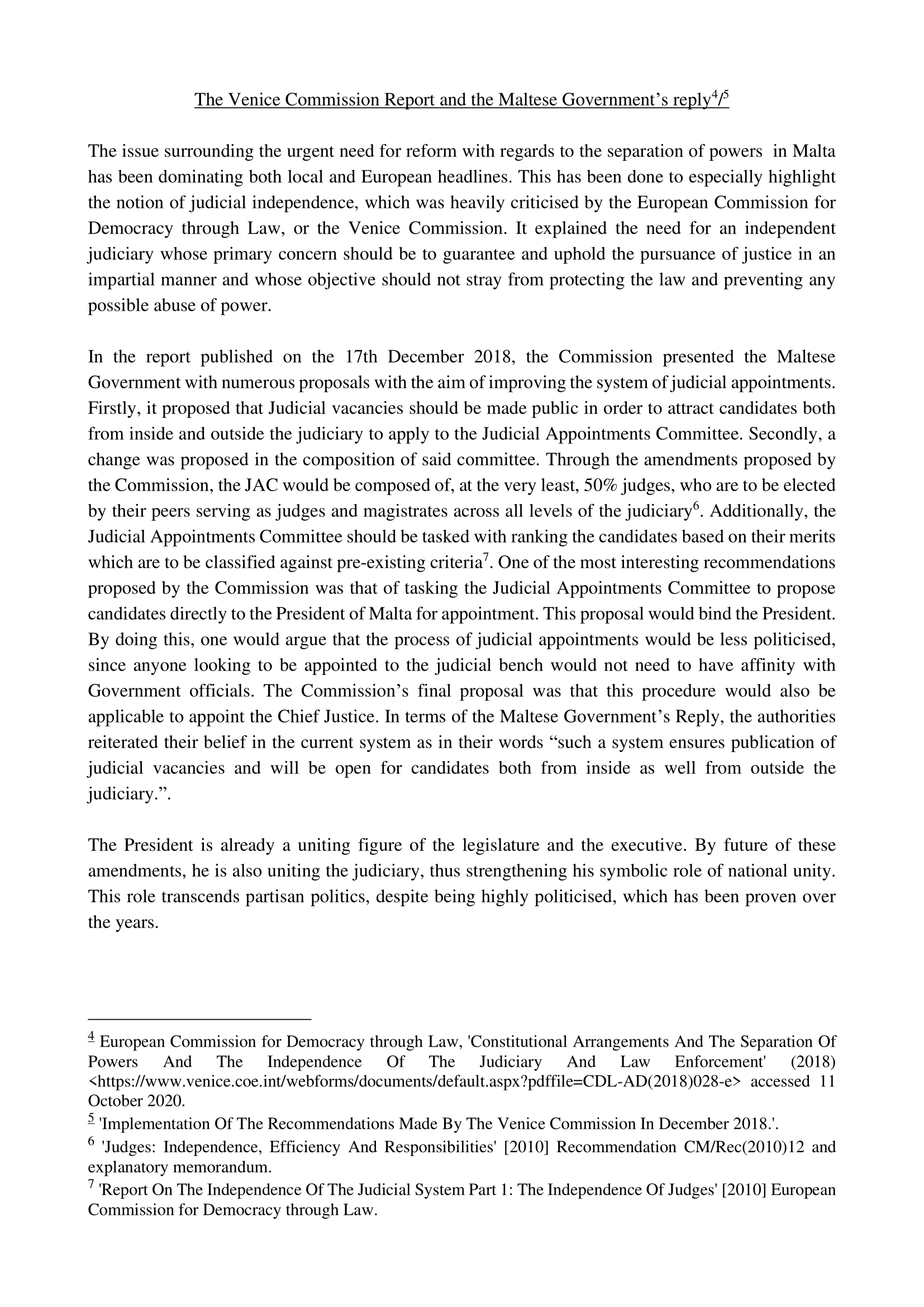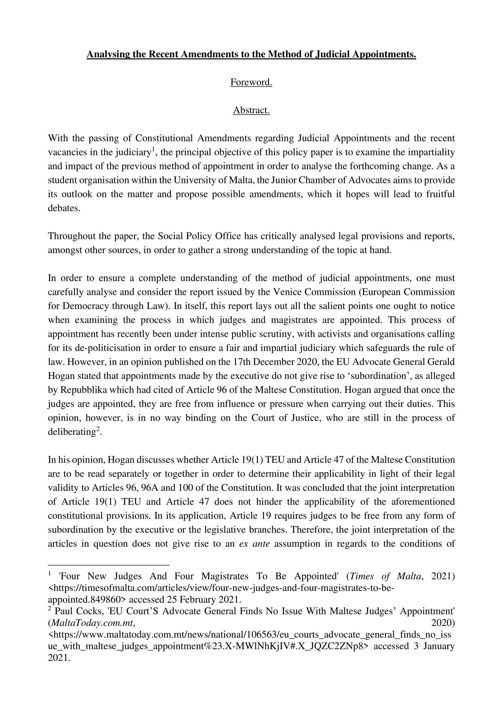 The proposals put forward by the Venice Commission, which are delved into individually in this social policy paper, primarily relate to judicial vacancies, the Judicial Appointments Committee, the role of the President of the Republic of Malta in regards to the appointment and removal of members of the judiciary, including that of the Chief Justice, in order that the judicial process may become less politicised. Furthermore, a comparison is also created between the old system of appointment and removal of members of the judiciary and the newly-implemented system put forward by the Venice Commission. The functions of the Attorney General and the State Advocate in view of such amendments are also examined in this social policy paper, whilst the importance of an independent judiciary is also emphasised in order that the protection of the rule of law may be guaranteed and the doctrine of the separation of powers be upheld.