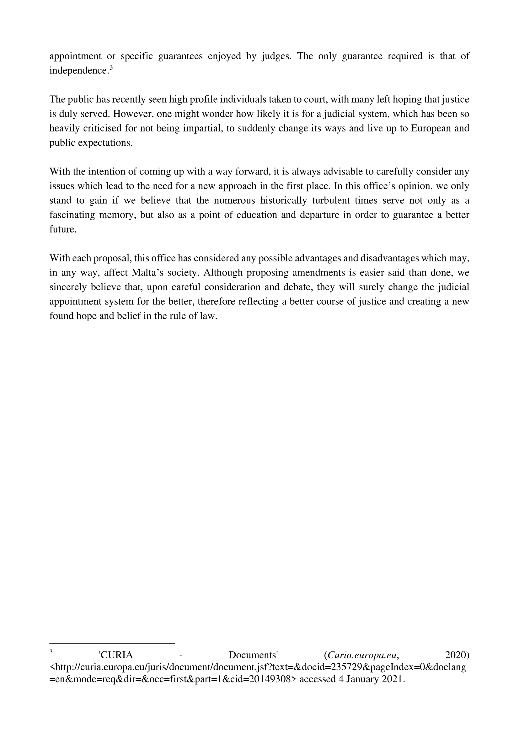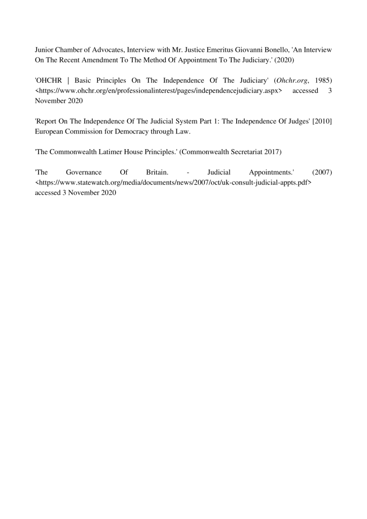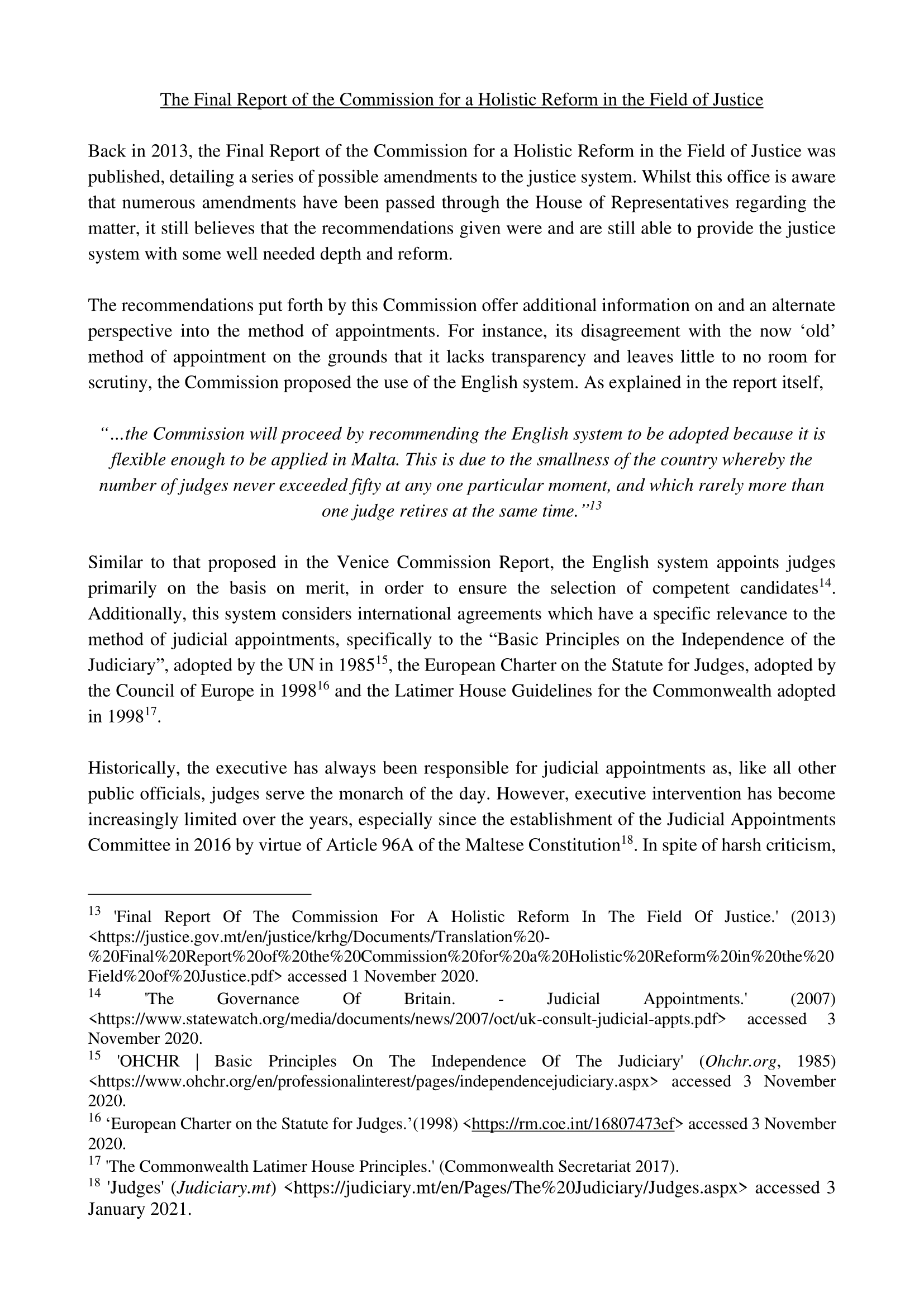 Ultimately, JCA is in favour of these amendments and agrees with the conclusions reached by the Final Report of the Commission for a Holistic Reform in the Field of Justice and its call for improved criteria in regards to Judicial Appointments so that justice may be both guaranteed and safeguarded.