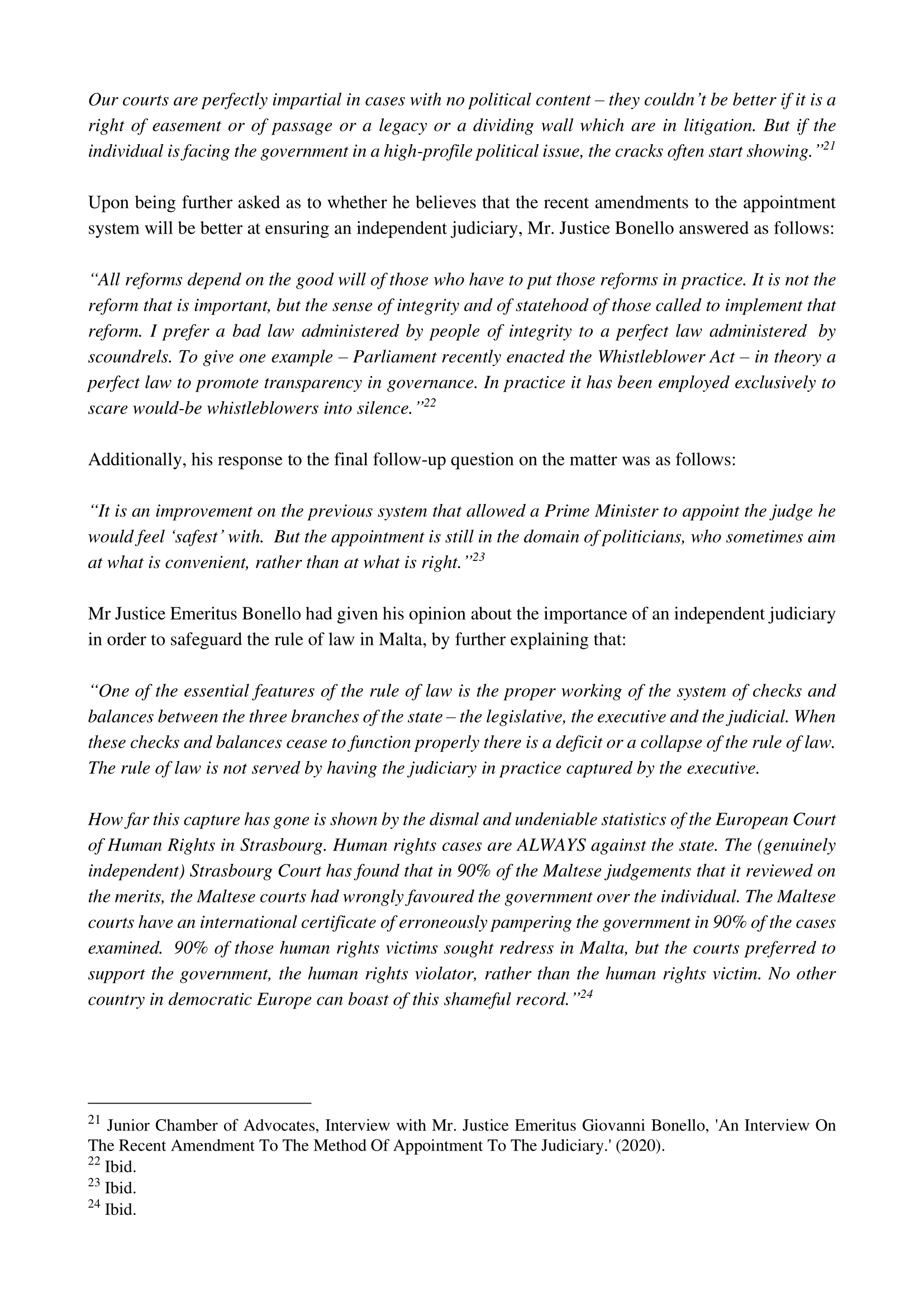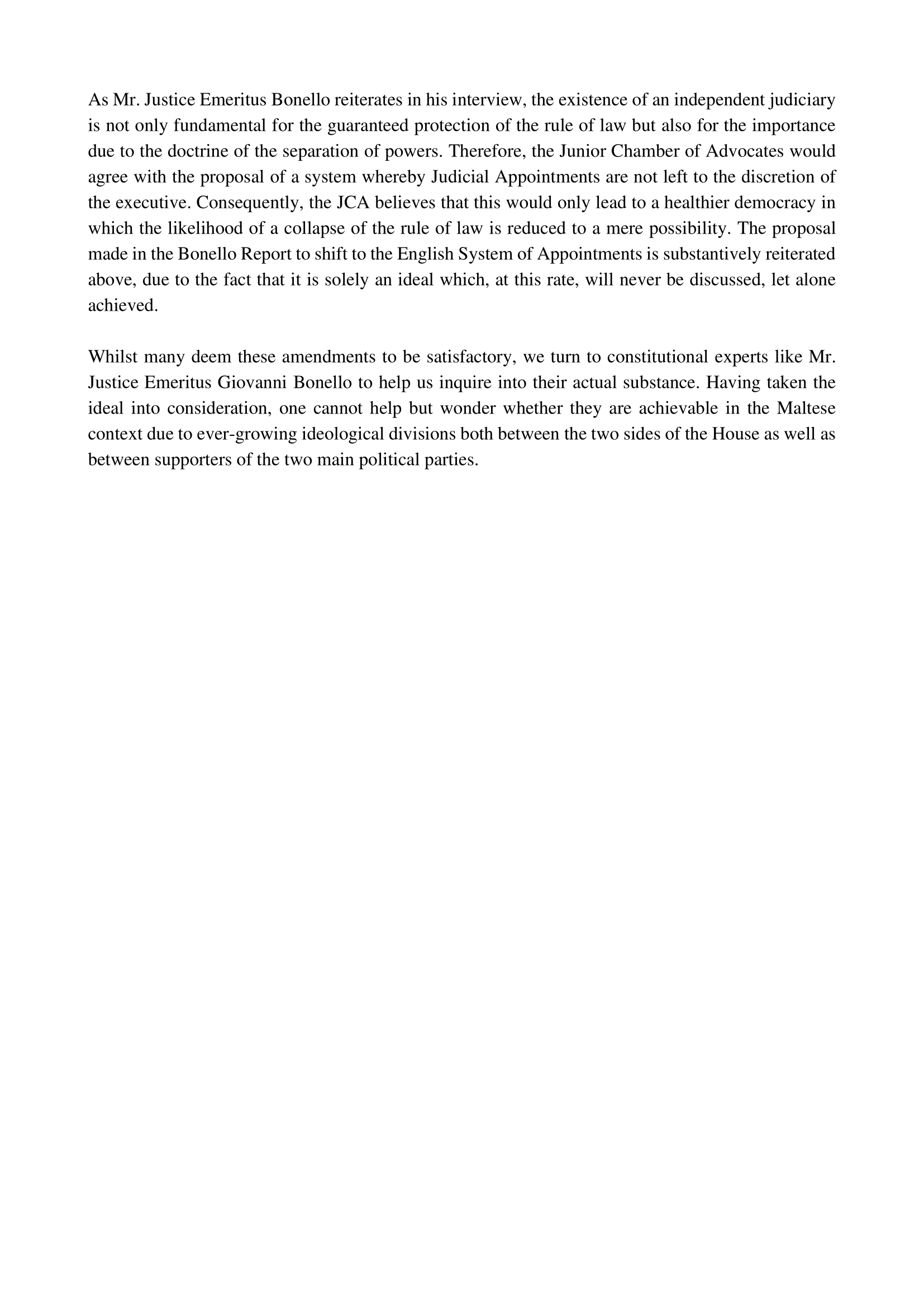 In order for the Junior Chamber of Advocates to inform itself better on the subject and arrive at an informed conclusion as to where it stands in view of such proposals, JCA has also consulted with Dr Tonio Borg and Mr. Justice Emeritus Giovanni Bonello.