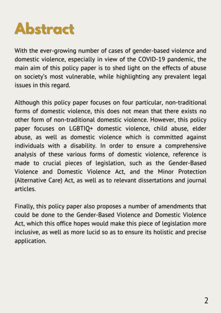 “With the ever-growing number of cases of gender-based violence and domestic violence, especially in view of the Covid-19 pandemic, the main aim of this policy paper is to shed light on the effects of abuse on society’s most vulnerable, while highlighting any prevalent legal issues in this regard.”